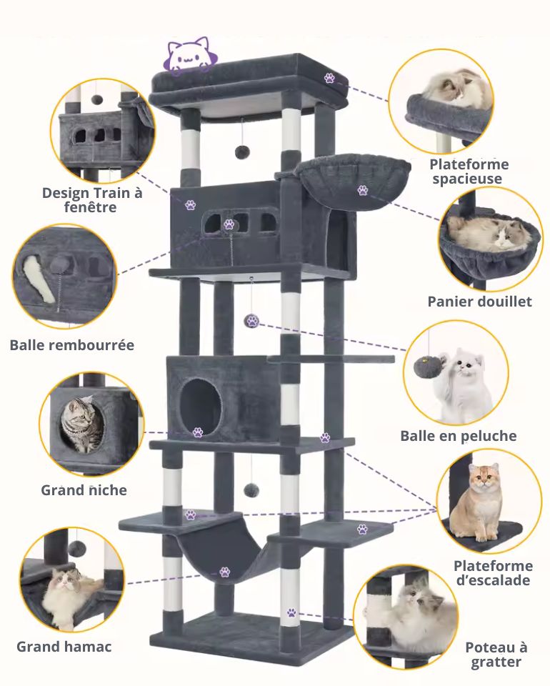 Grâce à sa base renforcée, ses poteaux robustes et son kit anti-basculement, il offre une stabilité rassurante, même lorsque plusieurs chats s’y poursuivent ou sautent en même temps.